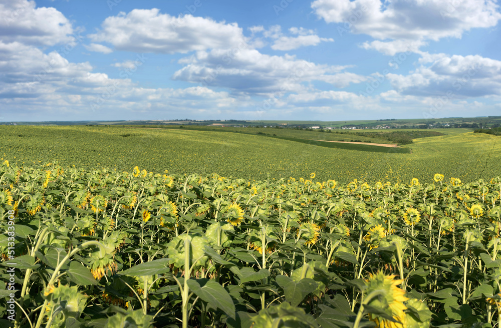 close up of inverted heads of sunflower flowers by the sun, sunflower field and mountains, agricultural hilly summer landscape, focus on plants