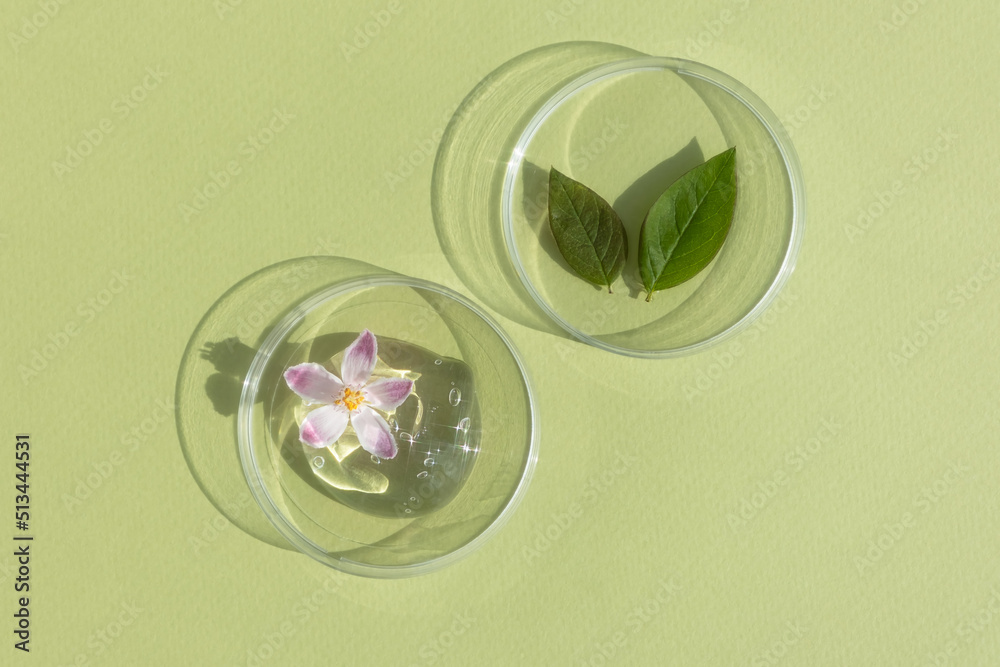 Facial serum or gel with pink flower and leaves in Petri dishes on a green background. Concept of cosmetics laboratory researches, wellness, beauty and natural cosmetics
