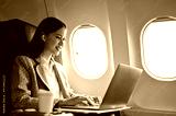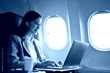 Professional asian businesswoman using laptop during a flight flying to her destination.