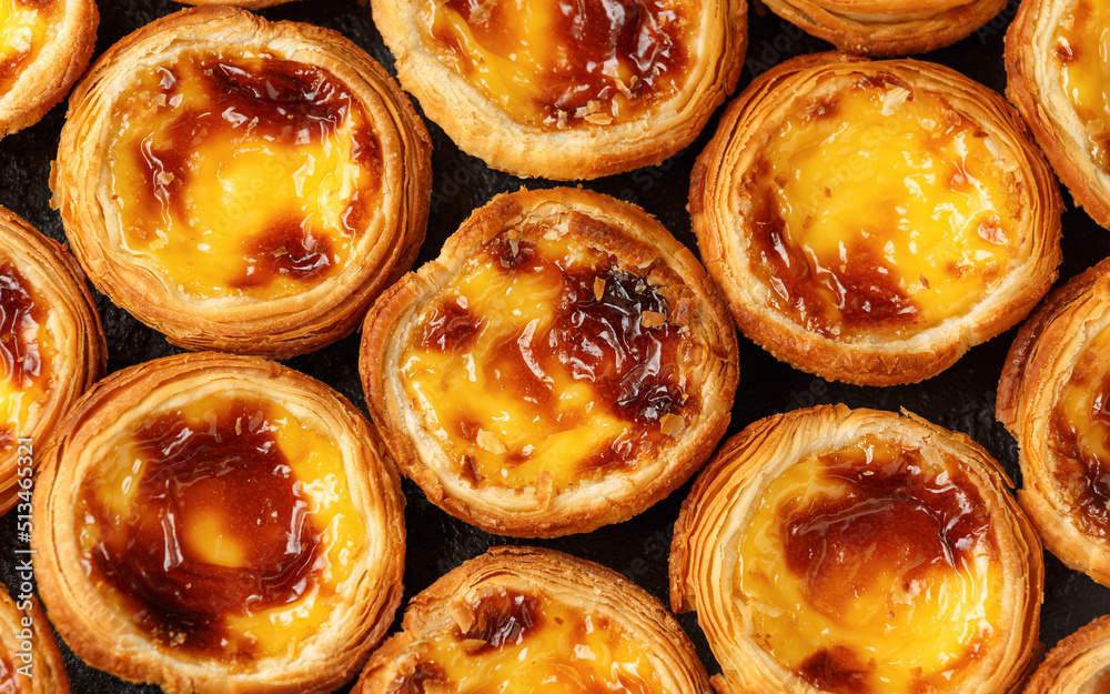 Traditional Portuguese custard tarts or Pastel de Nata freshly baked and cooling on rack