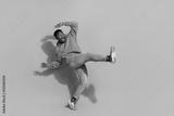 Full length portrait of cheerful satisfied person enjoy free time discotheque isolated on violet color background