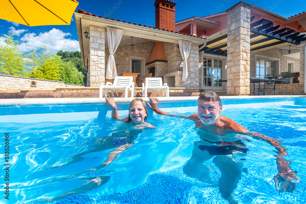 Croatia, Istria, Pula, blonde girl and grandfather at the pool