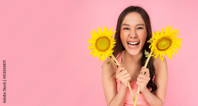 Portrait cheerful asian women holding flowers or sunflower Beautiful girl looking at camera with smile face Copy space isolated over pink pastel color background She ready for Party Travel Vacation