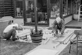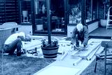 Adult son and father carpenter working together, handle wooden timbers in the garden. Patio construction by your own. DIY, Do it yourself. Home renovation, improvement, refurbishment. Selective focus
