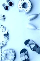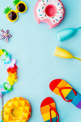 Flat lay of summer vibes concept with colorful pool party items, funny sunglasses, cocktail glasses, pineapple and donut inflatable drink holders, flip flops and flower necklace on the blue background