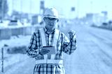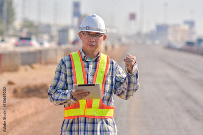 Senior Engineer Asian man working with tablet technology construction, construction worker with tablet computer and wearing construction uniform