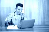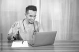 Asian doctor working laptop computer in office at hospital, doctor physician talking, consulting patient online by webcam video call on laptop computer.