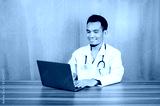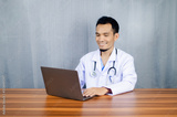 Asian doctor working laptop computer in office at hospital, doctor giving online consultation to his client online at clinic. Therapist talking to patient on web