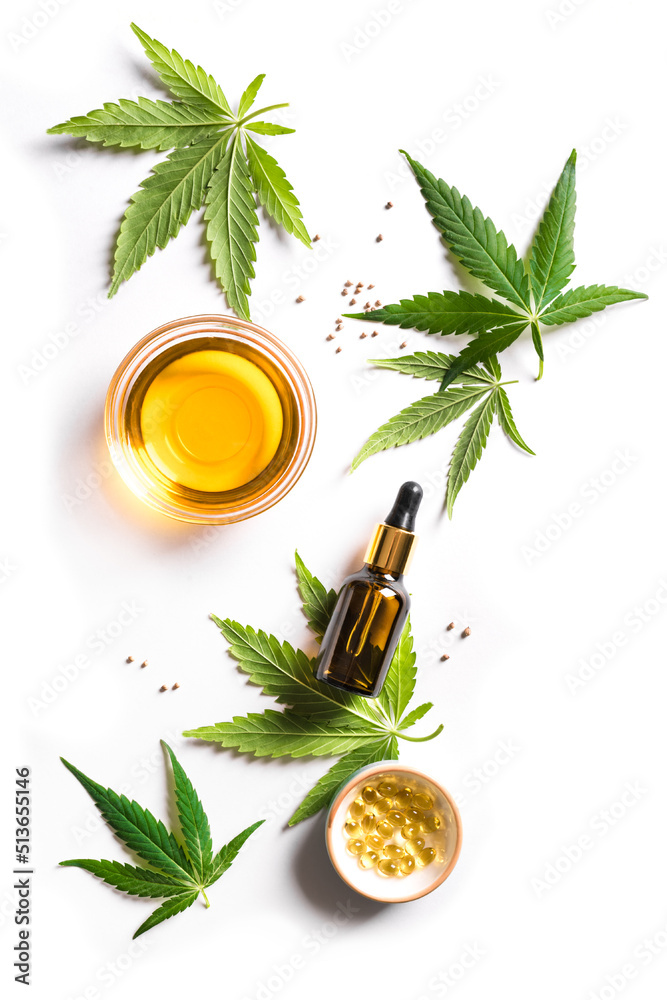 Hemp cannabis leaves and oil in bottle and capsules