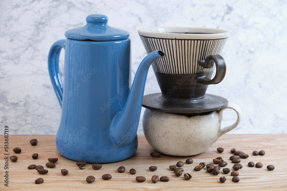 ケトル、カップ、ドリッパー、。コーヒー豆