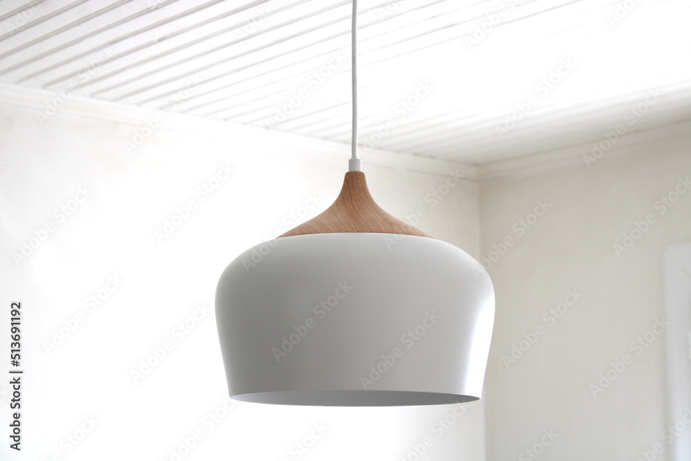 Suspension scandinave, luminaire metal blanc et bois, intérieur design nature