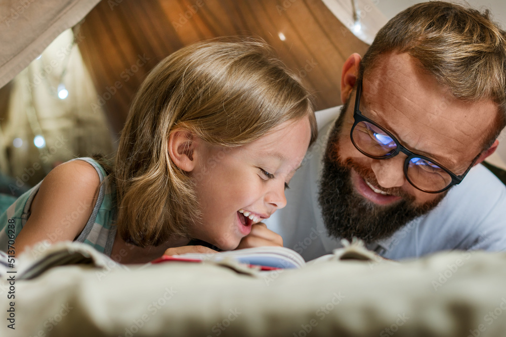 Portrait of a 6 year old boy and his father reading a book in teepee tent. Father and son with flashlight reading book under blanket at home. Family bonding and enjoying weekend together. Father day.