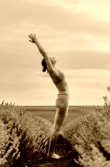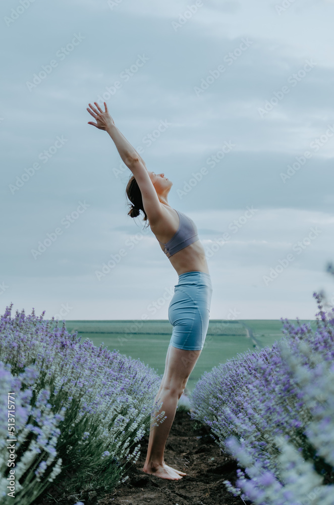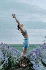 Woman in pastel tones activewear doing yoga pose backbend in the middle of a lavender field on a cloudy day.