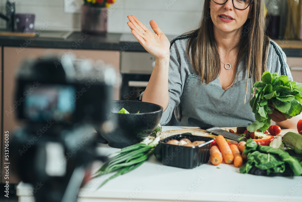 An Anonymous Woman Holding Lettuce While Sitting At Kitchen Desk And Filming Video For Her Food Channel