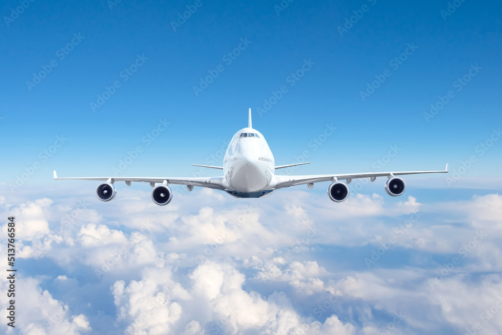 Airplane travel flying in the sky, looking directly at the liner with four engines.