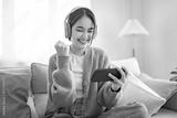 Excited young asian woman hold phone chatting in dating app feel happy sit on sofa at home, Closeup joyful female reading good news on phone. Surprised lady celebrating victory on phone