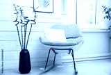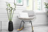 Vase with green bamboo stems and stylish rocking chair in room. Interior design