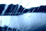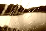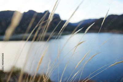 Dry wild grasses blow in the breeze with the wild mountains and lake behind them