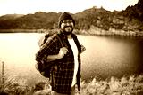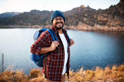 A happy hiker poses by the lakeside with backpack and beanie in the fall weather