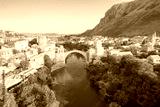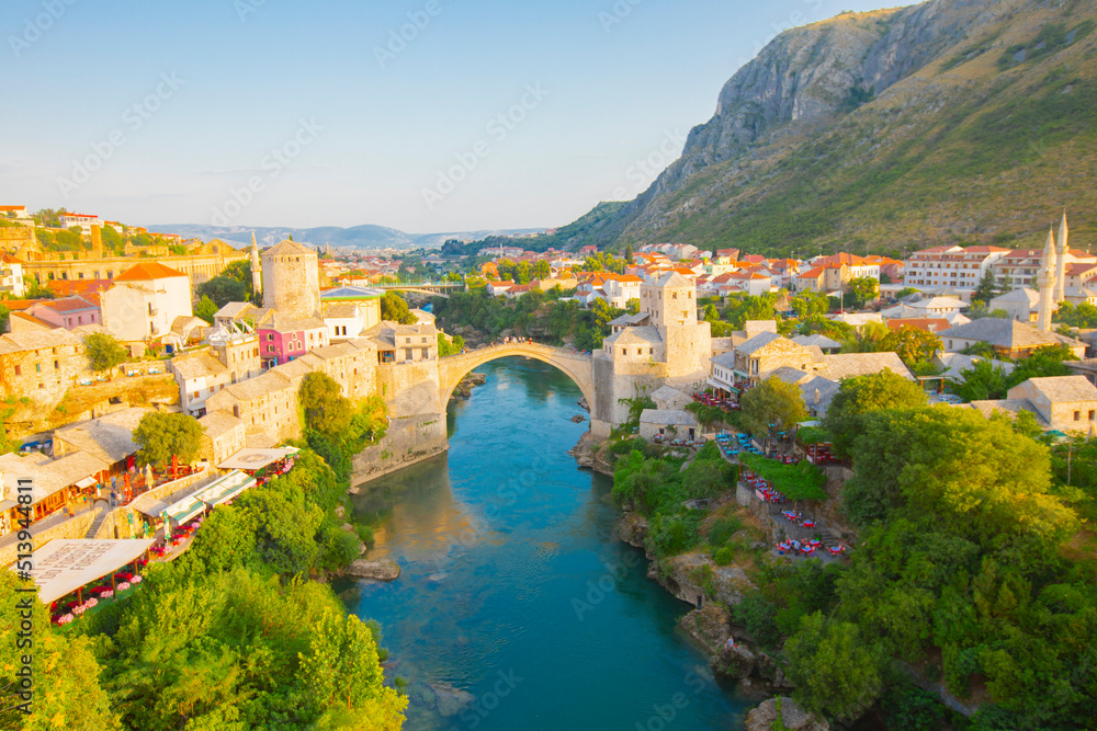 Fantastic Skyline of Mostar with the Mostar Bridge, houses and minarets, during sunny day. Location: Mostar, Old Town, Bosnia and Herzegovina, Europe