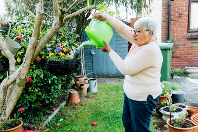Senior, mature woman watering flowers with watering can in the garden in a sunny day. Retired elderly woman and gardening hobby. Active Retirement lifestyle. Selective focus, copy space
