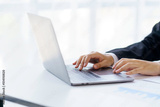 Close up of woman hand printing using laptop computer on the desk in the office.