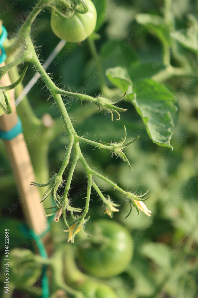 Flowering tomato plant in the vegtable garden. Yellow Solanum lycopersicum flowers on summer