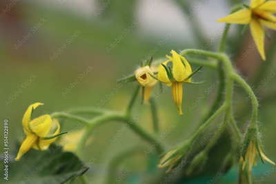 Flowering tomato plant in the vegtable garden. Yellow Solanum lycopersicum flowers on summer
