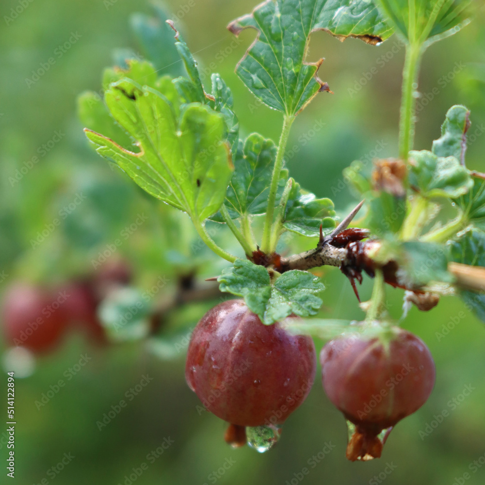 Ripe red gooseberries fruit on a branch covered by raindrops. Ribes uva-crispa on summer after rain