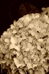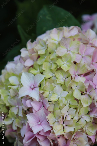 Close-up of pink and white hydrangea flower on bush in the garden. Hydrangea macrophyla on summer