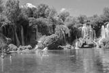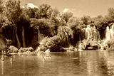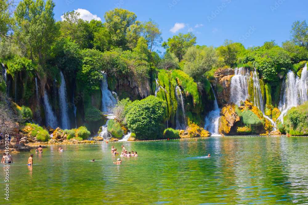 Small boat rowing just under Kravica waterfalls in southern Bosnia and Herzegovina