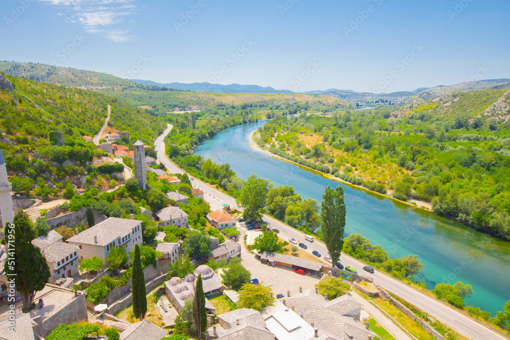 View over the village of Pocitelj with its mosque and traditional houses in Bosnia and Herzegovina