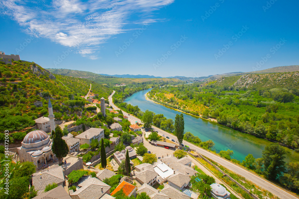 View over the village of Pocitelj with its mosque and traditional houses in Bosnia and Herzegovina