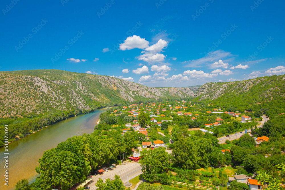 View over the village of Pocitelj with its mosque and traditional houses in Bosnia and Herzegovina