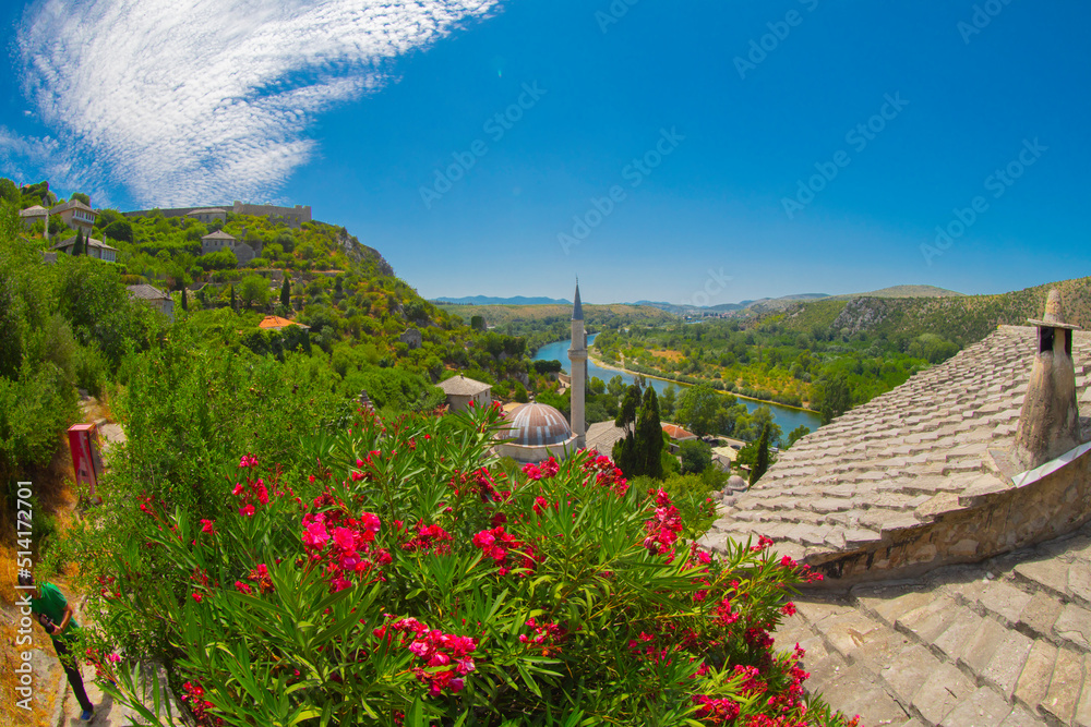 View over the village of Pocitelj with its mosque and traditional houses in Bosnia and Herzegovina