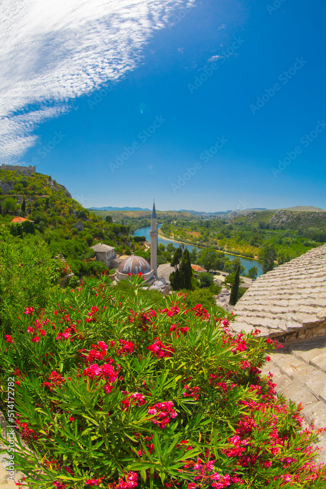 View over the village of Pocitelj with its mosque and traditional houses in Bosnia and Herzegovina