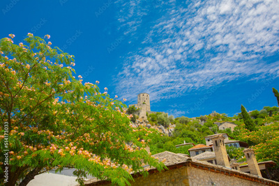 View over the village of Pocitelj with its mosque and traditional houses in Bosnia and Herzegovina