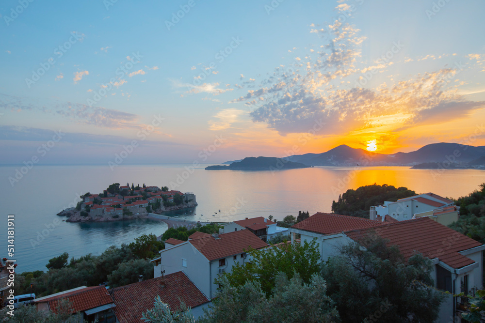 View of beauty sunset over Sveti Stefan, small islet and resort in Montenegro. Balkans, Adriatic sea, Europe.