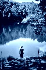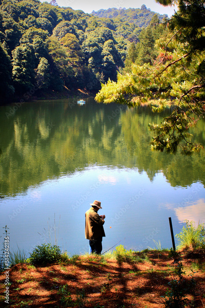 fisher in a lake with natural landscape around with reflections in the water in villa del carbon state of mexico