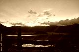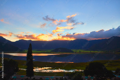 beautiful sunset in crater of volcano with lake with reflections and sky in fire in tepetiltic nayarit