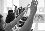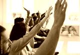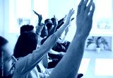Happy diverse multiracial male female audience raising hands to ask speaker questions. Young mixed race multiethnic men and women sitting in row with hands up after interesting lecture or masterclass