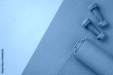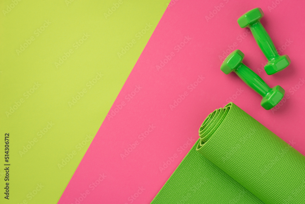 Fitness accessories concept. Top view photo of sports mat and dumbbells on bicolor pink and green background with copyspace