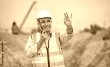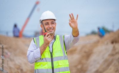 Surveyor engineer wearing safety uniform ,helmet and radio communication with equipment theodolite to measurement positioning on the construction site of the road with construct machinery background