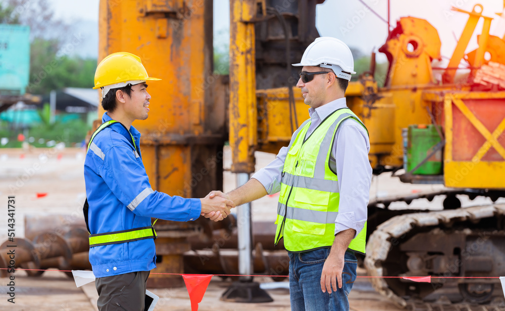 Surveyor engineer wearing safety uniform ,helmet and radio communication with equipment theodolite to measurement positioning on the construction site of the road with construct machinery background
