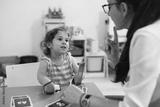 teacher and girl in kindergarten, learning how to correct pronouncing words