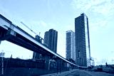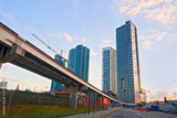 Miami Florida, Brickell and downtown financial buildings and train bridge on a beautiful summer day with blue sky