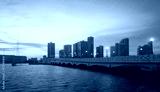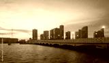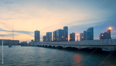 City of Miami Florida, sunset panorama of downtown business and residential buildings and bridge