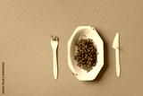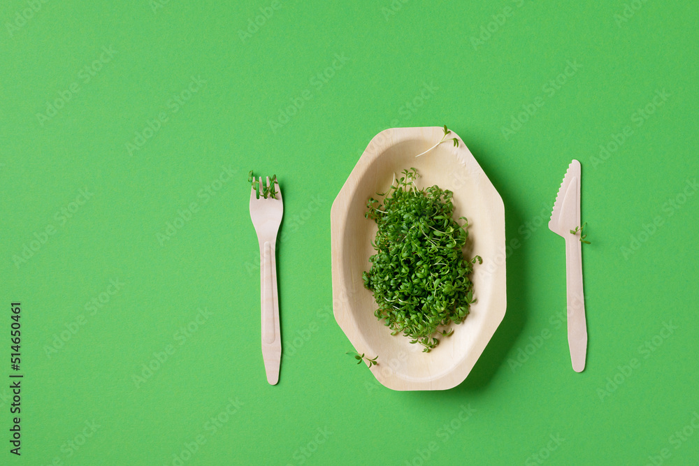 Eco friendly and zero waste concept on green background from wooden tableware with microgreens top view and flat lay.