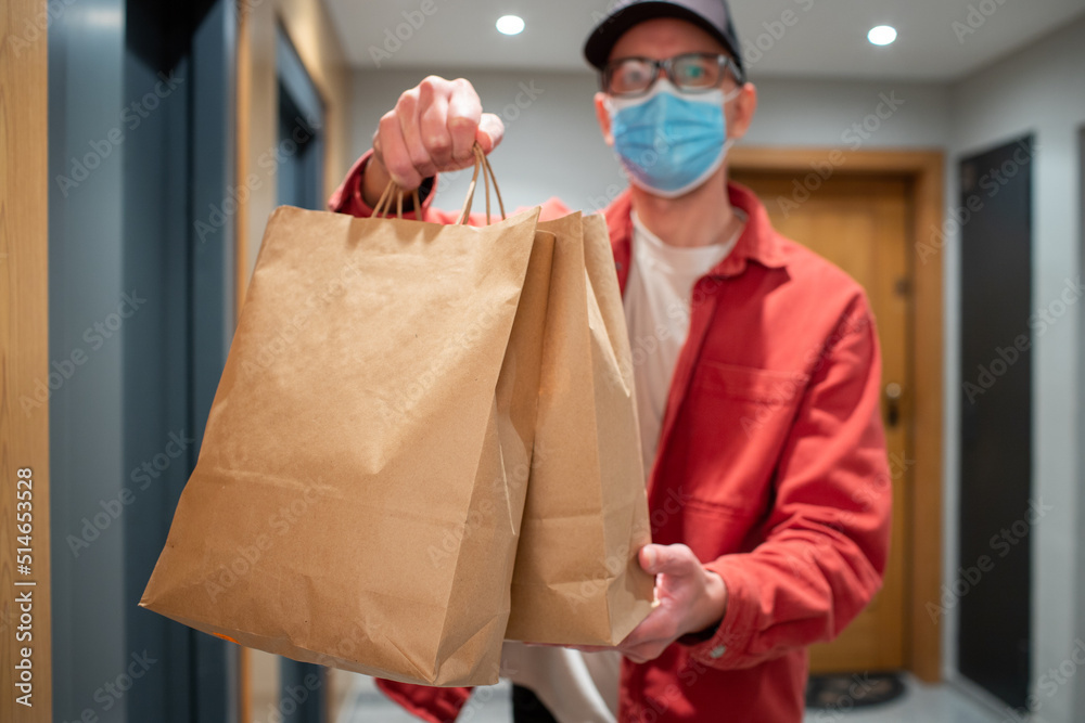 Delivery man in protective mask holding paper bag with food in the entrance. The courier gives the box with fresh vegetables and fruits to the customer