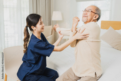 Asian nurse woman assisting old man warming up exercises for the upper body inside the nursing home, use walker with strong health and Help and care concept